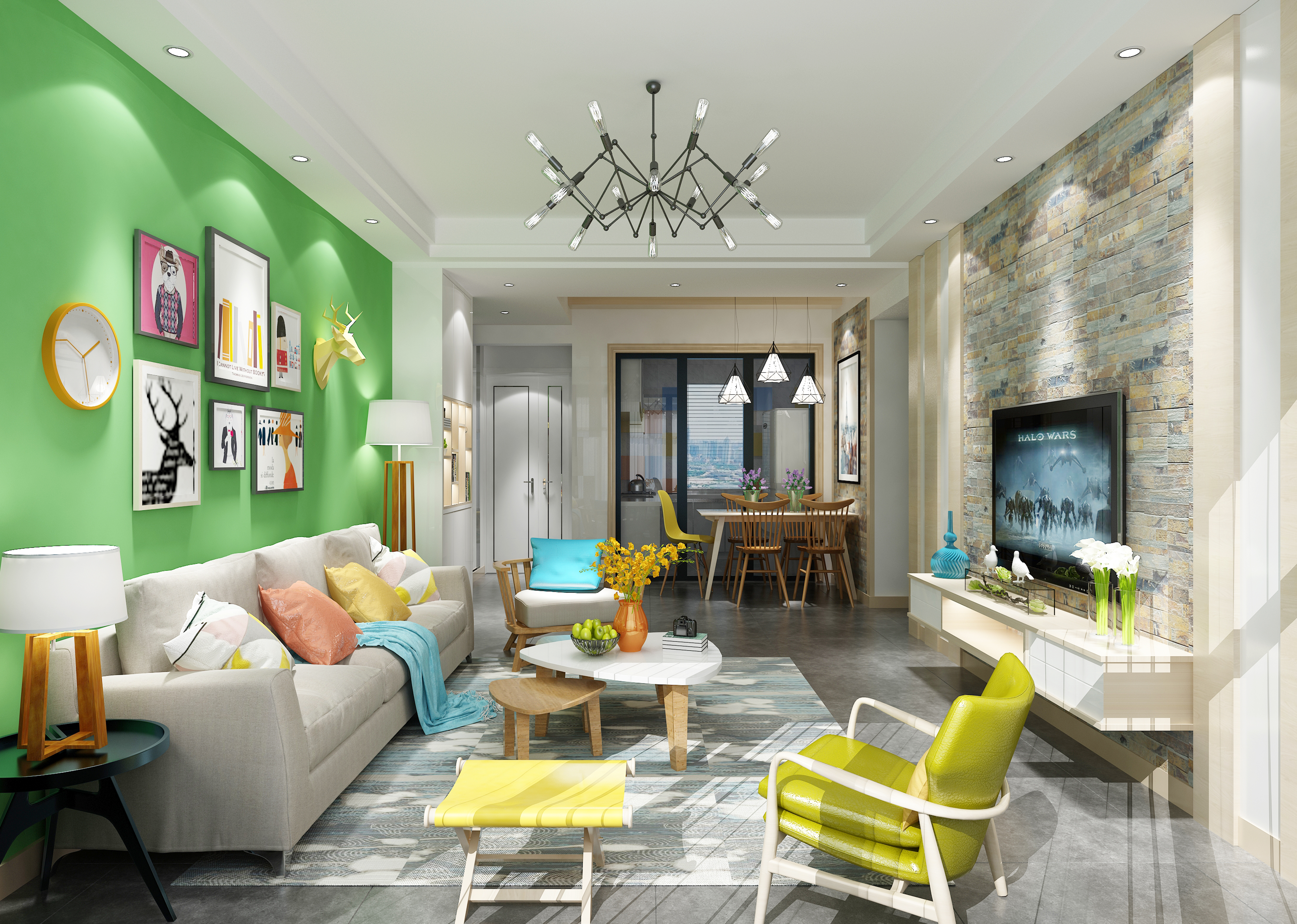 這種形式一般以電視為視覺(jué)中心,在其上方、側(cè)邊或整體展開(kāi)布置。其設(shè)計(jì)手法也是不拘一格、豐富多樣?;蚪M合線條利落的隔板進(jìn)行設(shè)計(jì),讓畫面顯得更為協(xié)調(diào)美觀。