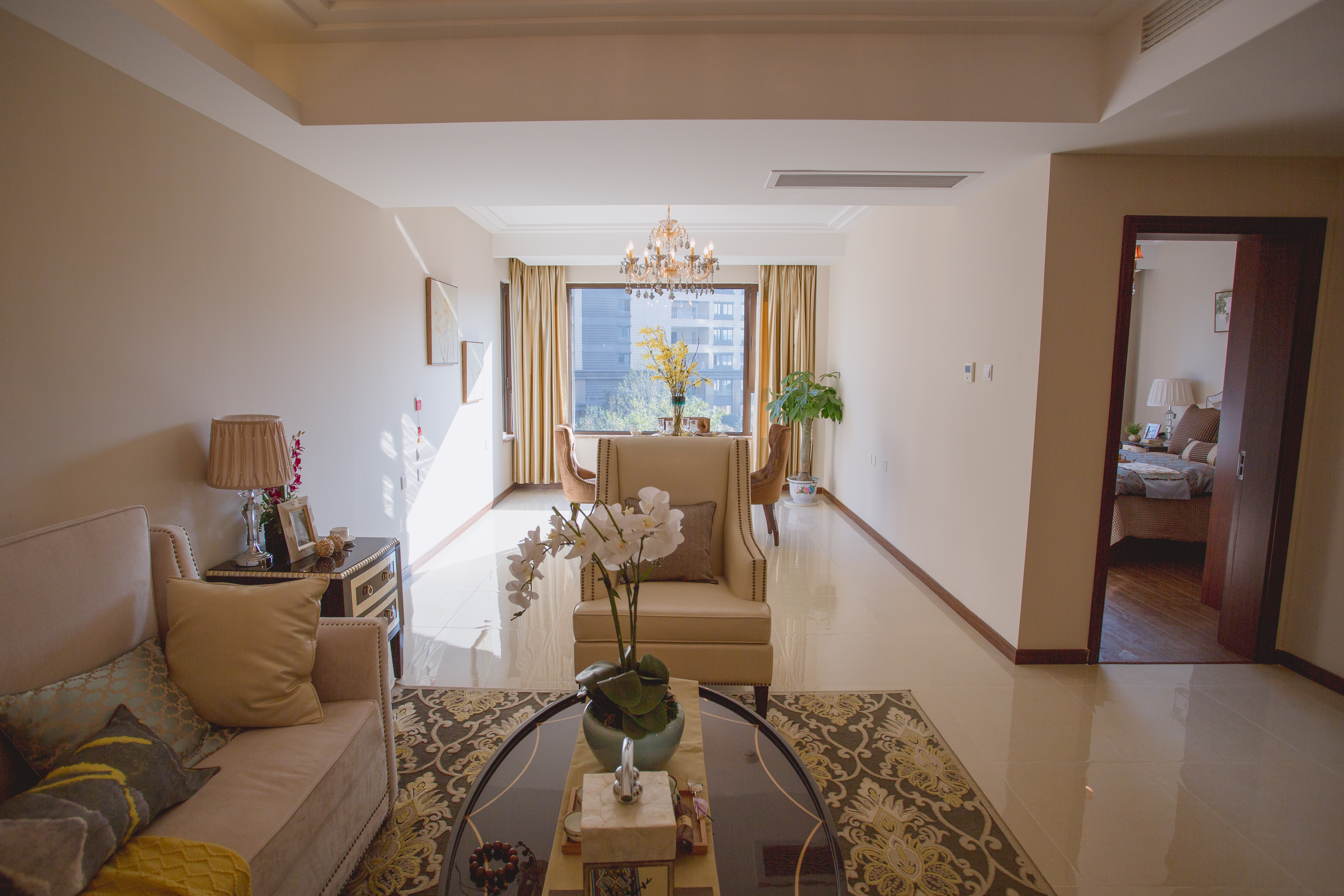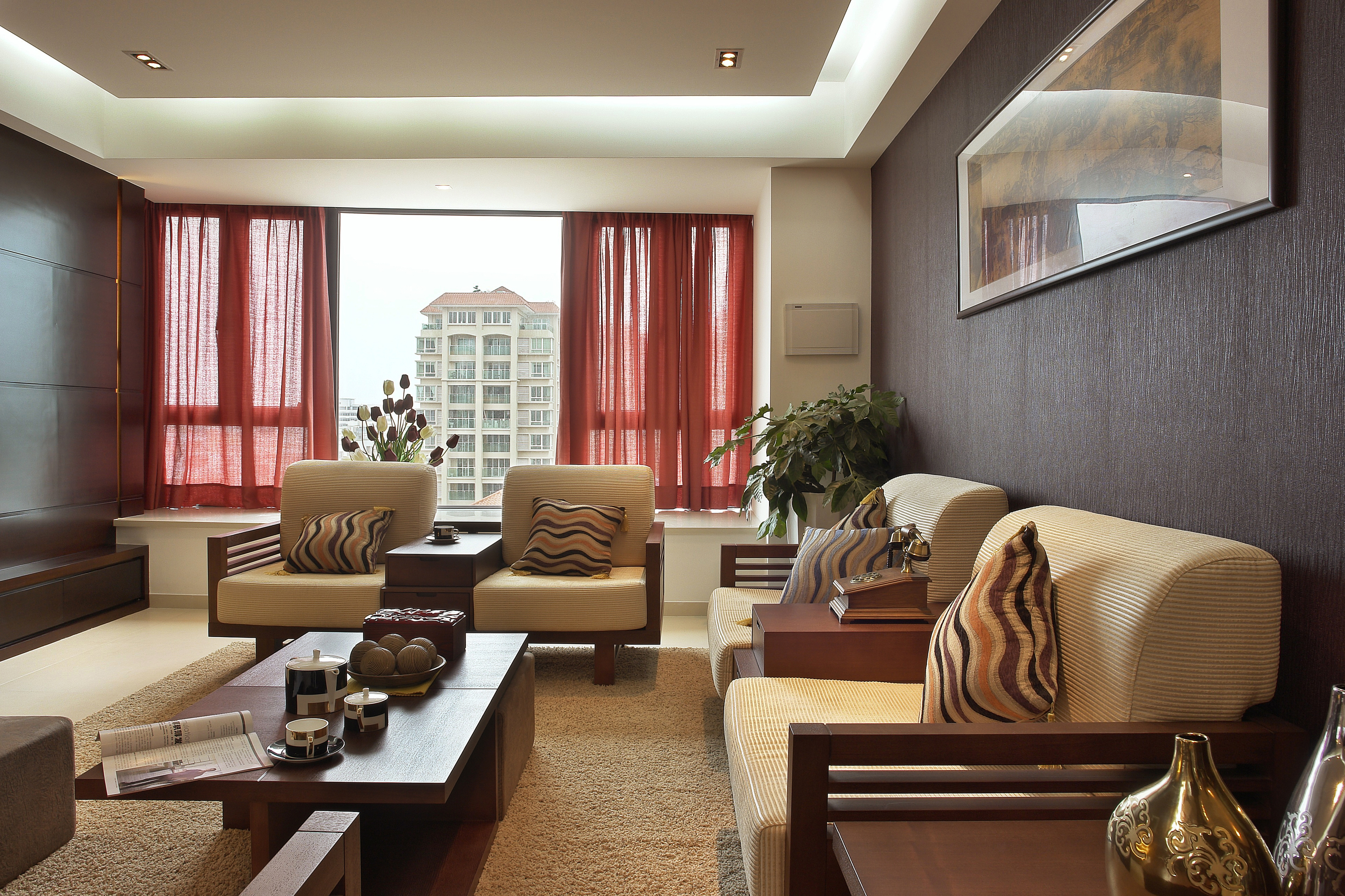沙發(fā)的話可以采用過度加色,就是在同一色系的基礎上一次著深,這樣的話過度就會非常的自然。同理櫥柜跟臥室里的衣柜也是可以采用這樣的方法。